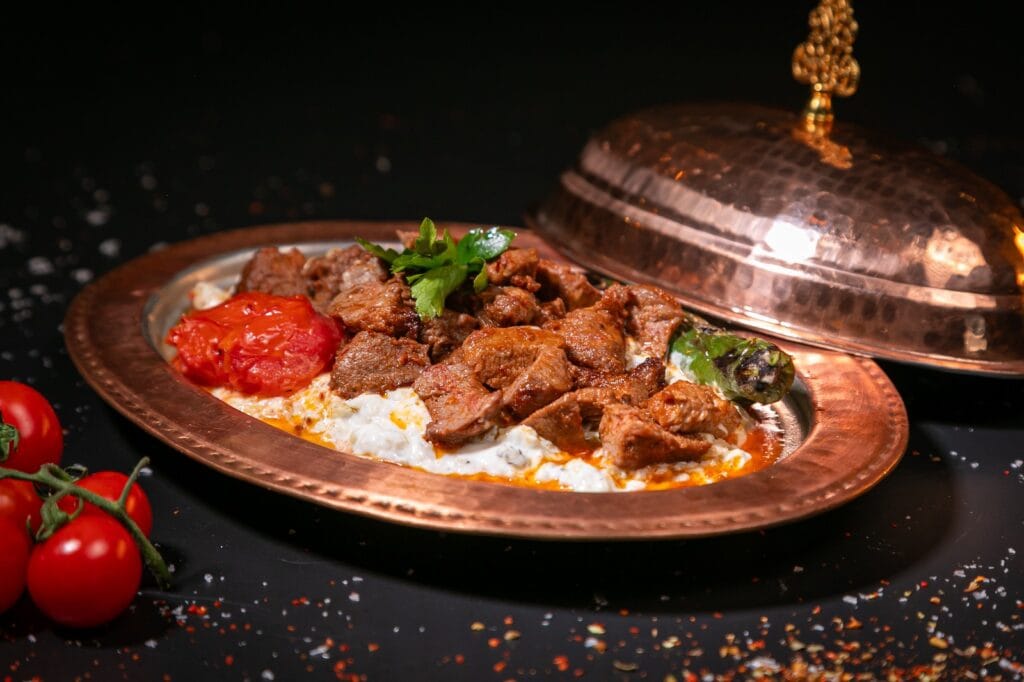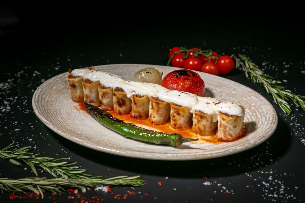 Beyti Sarma Contents: Minced lamb mixed with red pepper, green pepper, garlic and parsley, wrapped with lavash bread, served yogurt with Iskender sauce Price: 135.000 UZS
